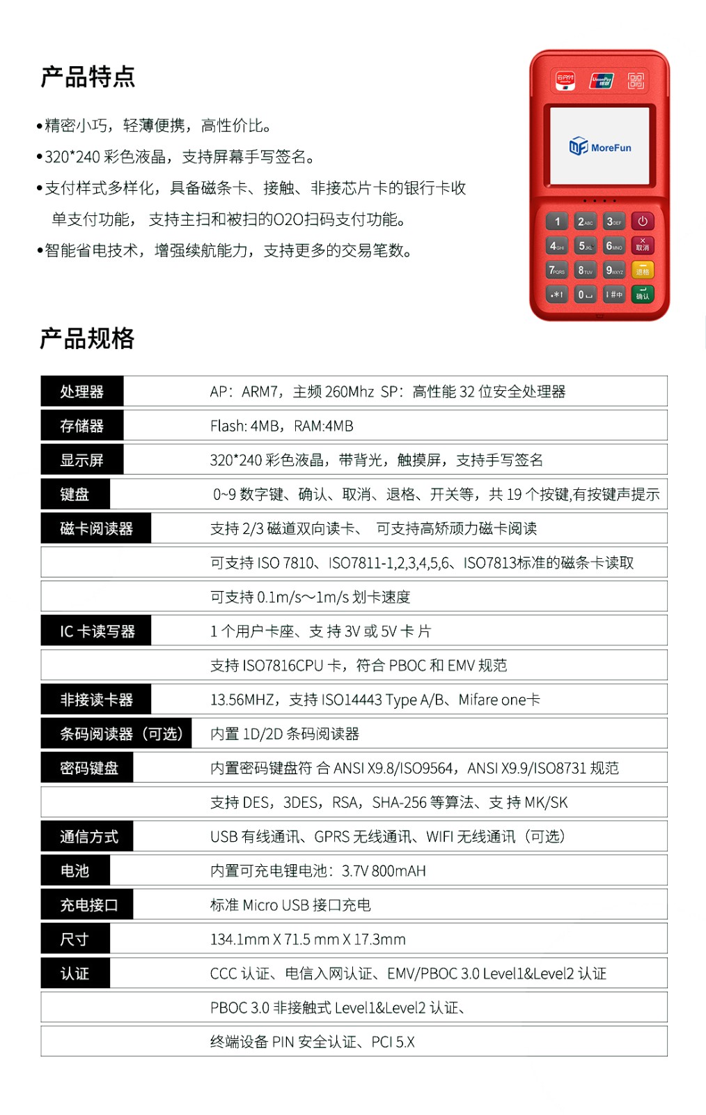 首页>>西青产品中心>>西青手持无线POS 西青联动优势-优POS Pro 高配版 * 性能优越:32位高性能ARM11安全CPU;整机通过业内更先进的PCI PED4.X 安全认证及国内受理终端PIN输入设备安全评估检测认证,多项措施保障金融交易的安全;* 时尚外观:外形小巧携带方便,高抗跌落性能、宽工作温度、防水防尘设计、外壳坚固耐刮、户外携带式作业更加耐久可靠。* 通讯备份:支持2G-3G扩展;* 超长续航:3.7V-800毫安稳定续航能力,智能电池管理保证持续工作18小时,待机72小时。 标准配置 返 回